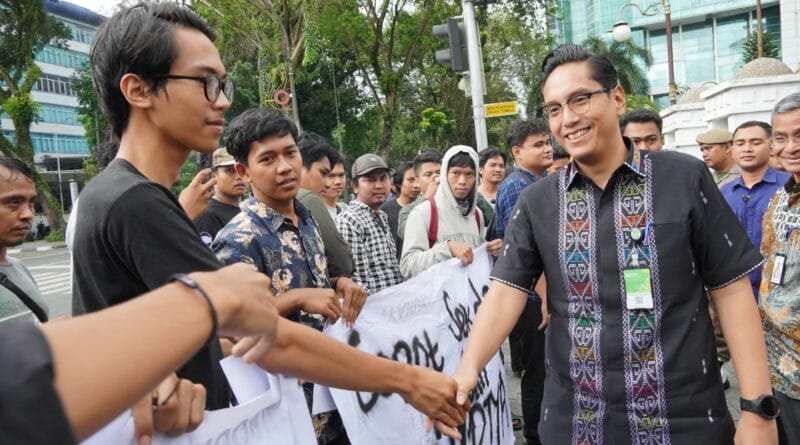 MEDAN – Di tengah hujan gerimi, Wali Kota Medan Rico Tri Putra Bayu Waas menemui puluhan mahasiswa yang tergabung dalam