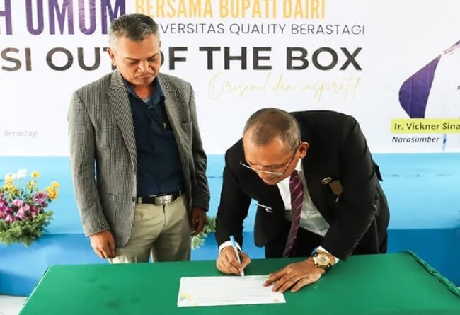 DAIRI – Pemerintah Kabupaten (Pemkab) Dairi bersama PT PLN (Persero) Unit Pelaksana Pelayanan Pelanggan (UP3) Bukit Barisan menandatangani komitmen bersama untuk meningkatkan kesejahteraan masyarakat melalui penyediaan listrik yang andal dan berkelanjutan. Penandatanganan berlangsung Selasa (26/8/2025), di sela kegiatan kuliah umum di Universitas Quality Berastagi, Kabupaten Karo.