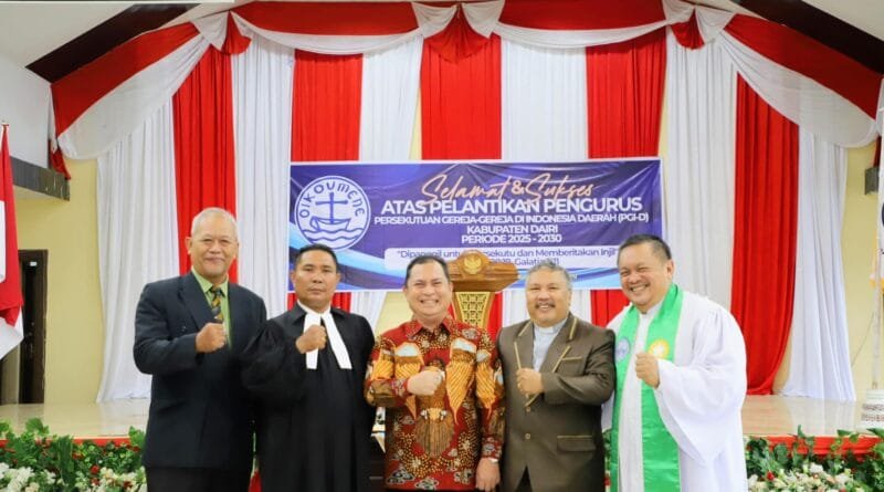 DAIRI – Penjabat Bupati Dairi Surung Charles Bantjin hadiri pelantikan pengurus Persekutuan Gereja-Gereja Indonesia Daerah ( PGI D) Kabupaten Dairi periode 2025-2030 yang bertempat di Gedung Balay Budaya, Jumat (14/02/2025).