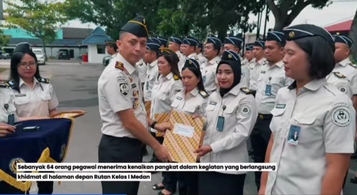 Sebanyak 64 orang pegawai menerima kenaikan pangkat dalam kegiatan yang berlangsung khidmat di halaman depan Rutan Kelas I Medan. Senin, (13/4).